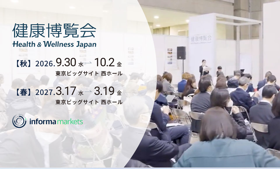 2026年9月30から10月2日まで開催される健康博覧会に出展いたします。 出展会場:東京ビックサイト西ホールにて