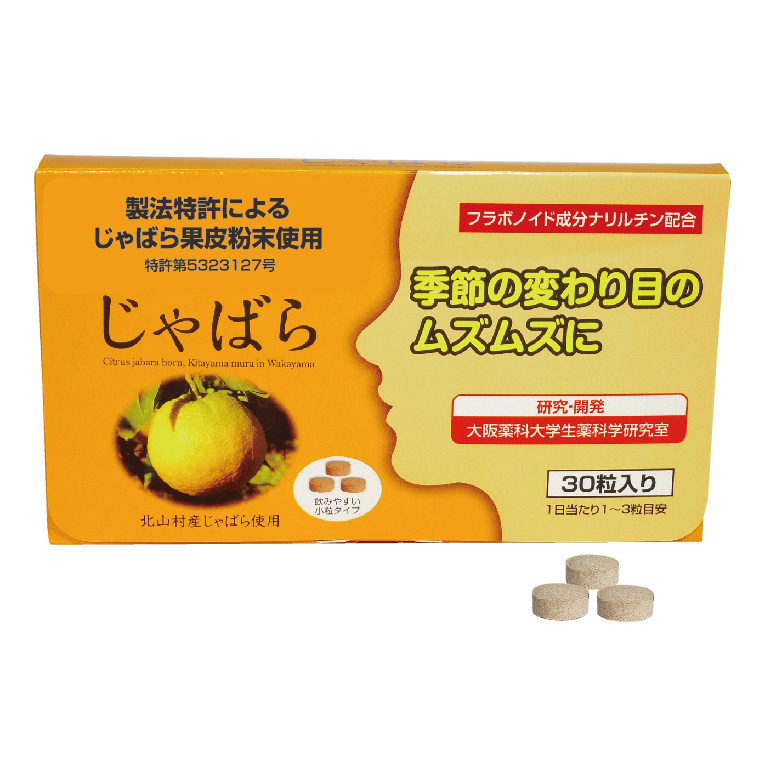 じゃばらの果皮に多く含まれるナリルチンが花粉症の症状緩和に役立つことが大阪薬科大学生薬科学研究室などの研究により解っています。和歌山県産のじゃばら果皮を特許製法で粉末にしたじゃばら果皮粉末配合サプリメント。