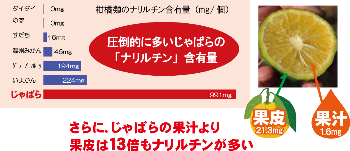 じゃばらにはフラボノイドの一種である「ナリルチン」が豊富に含まれています。ナリルチンは、他の柑橘類にも含まれていますが、じゃばらは、どの柑橘類よりもはるかに多く含まれています。