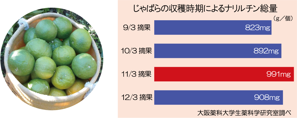 じゃばらは、完熟すると柚子のように黄色くなりますが、まだ青みが残っている時期(11月)に収穫されるじゃばらは、ナリルチン量(総量)が最も多くなります。