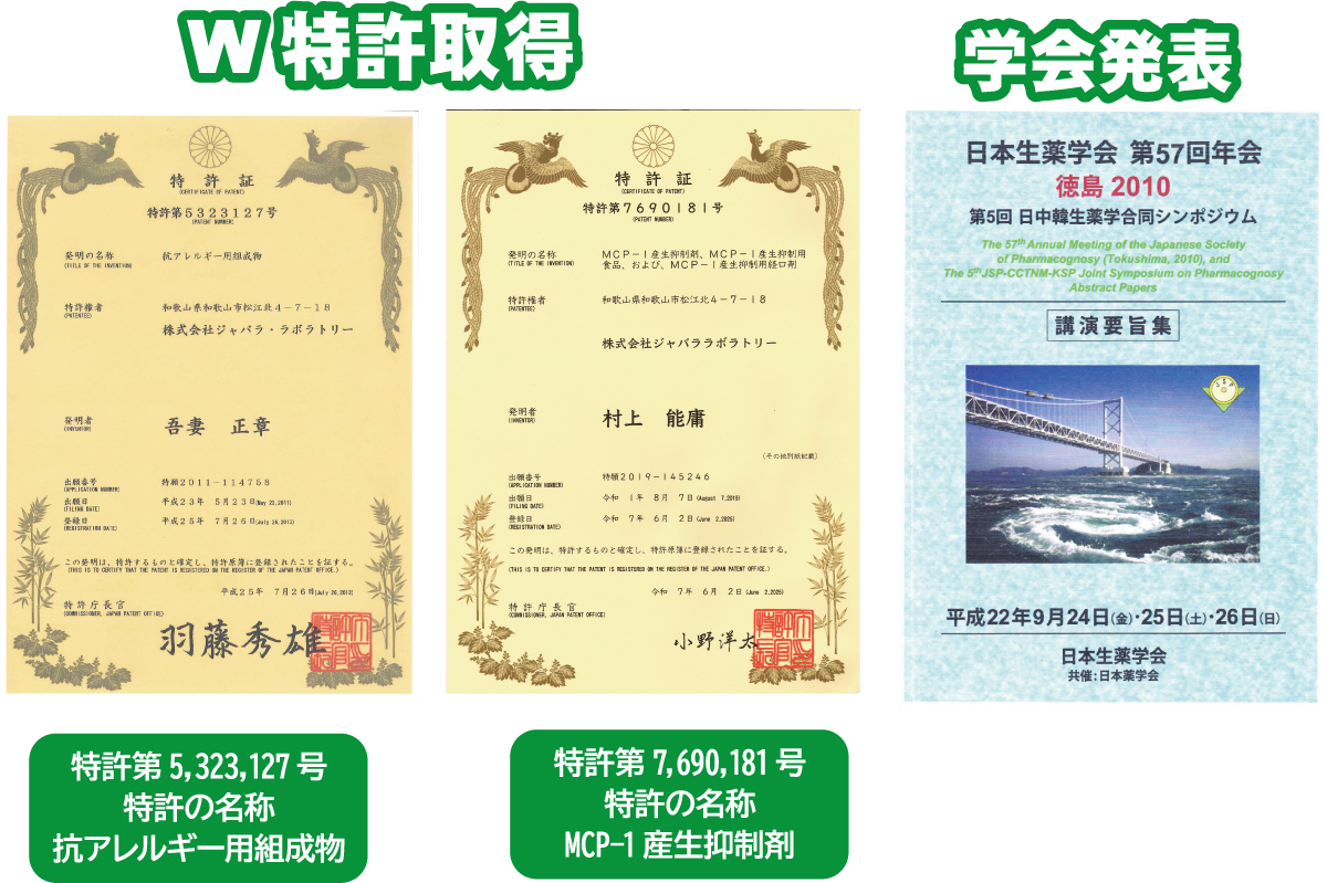 柑橘の果皮には酸化されると、アレルギーを誘発する成分が含まれています。その誘発率は、およそ20人に1人の割合との報告もあります。じゃばらも柑橘の一種ですから、果皮にはアレルギーを誘発しうる成分も含まれています。弊社のじゃばら製品にはアレルギー誘発物質を除去したじゃばら果皮粉末を使用しています。この製法で製造されたじゃばら果皮粉末は2つの特許を取得しています。また、生薬学会などでも発表されています。
